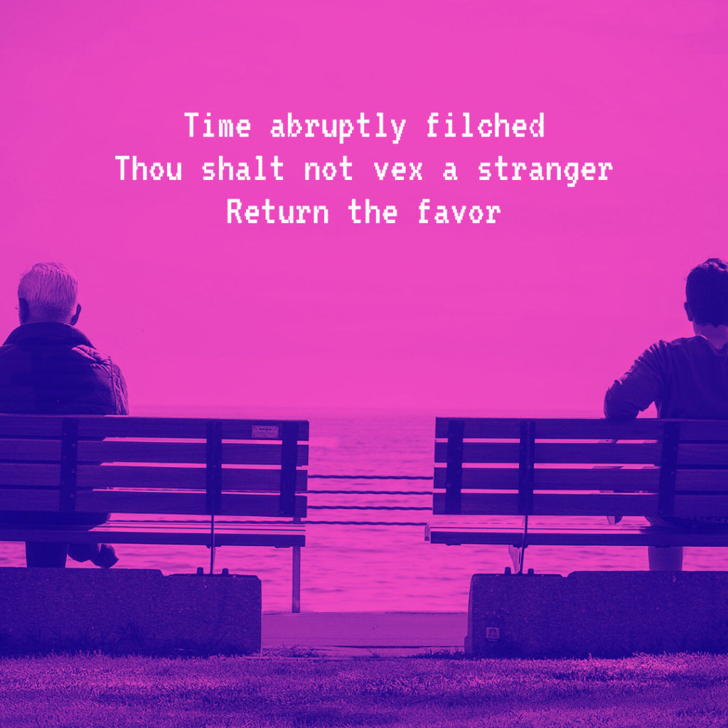 Reciprocate with Contempt by Aaron Hagenbuch|Published 03.05.2020 Time abruptly filchedThou shalt not vex a strangerReturn the favorAaron Hagenbuch